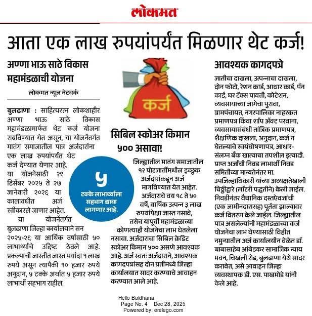 लोकशाहीर अण्णाभाऊ साठे विकास महामंडळामार्फत मातंग समाज आणि त्यातील १२ पोटजातींमधील नागरिकांच्या आर्थिक उन्नतीसाठी ‘थेट कर्ज योजना’ (Direct Loan Scheme) राबवली जाते. या योजनेअंतर्गत कर्ज मर्यादा आता ₹१ लाख पर्यंत वाढवण्यात आली आहे.  योजनेची ठळक वैशिष्ट्ये (२०२५) कर्ज मर्यादा: ₹१,००,००० पर्यंत. अनुदान: या योजनेत १०% अनुदान दिले जाते. व्याजदर: या कर्जावर नाममात्र व्याज आकारले जाते.  पात्रता निकष समाज: अर्जदार मातंग समाज किंवा तत्सम